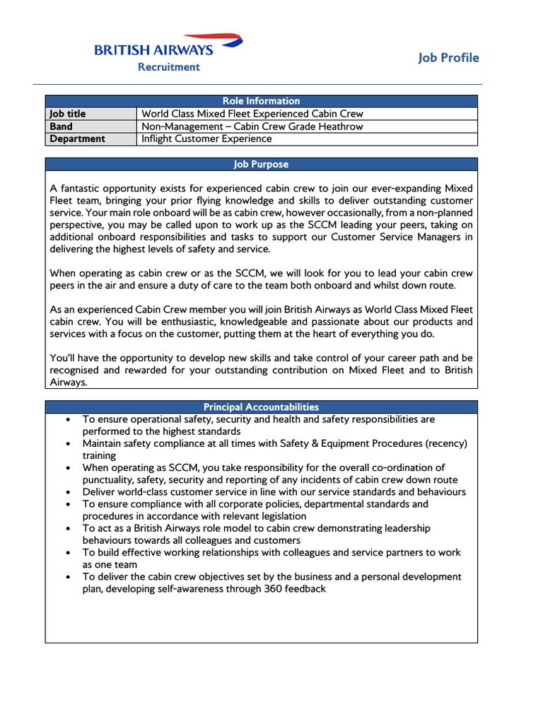 If you're looking for a job in cabin crew, here's a list of the top you qualities you must possess to set yourself apart from the competition. Becoming an air stewardess onboard any airline is a very exciting job in which you will get to travel all over the country and possibly even so start now and visit our job board jobsearchlink q=cabin crew l=united kingdom text=airport jobs for the best cabin crew jobs. Cabin another good way of working out what you need to demonstrate is to pay close attention to any documents you are sent in advance of your interview such as the 'job description' or 'person specification'.you need. It can be modified to fit the specific cabin crew profile you're trying to fill as a recruiter or job seeker. Cabin crew members look after passengers ensuring they have a safe and enjoyable flight.